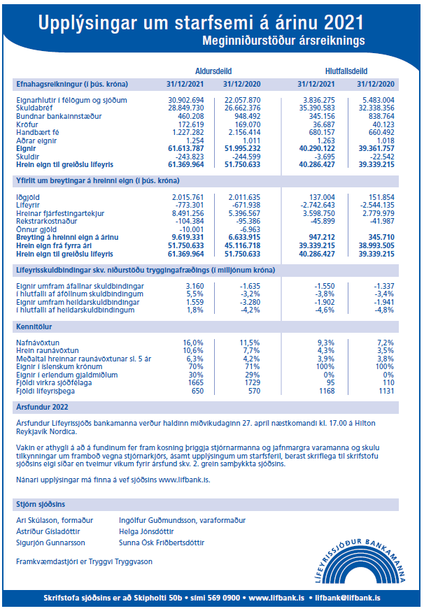 Hrein nafnávöxtun Aldursdeildar var 16,01% á árinu 2021 sem samsvarar 10,64% raunávöxtun samanborið við 7,71% raunávöxtun á fyrra ári. Hjá Hlutfallsdeild, sem býr við mun lægra áhættustig, var hrein nafnávöxtun 9,35% sem samsvarar 4,30% raunávöxtun samanborið við 3,54% raunávöxtun á fyrra ári. Meðaltal hreinnar raunávöxtunar hjá Aldursdeild er 6,3% síðustu 5 ár og 4,0% hjá Hlutfallsdeild.